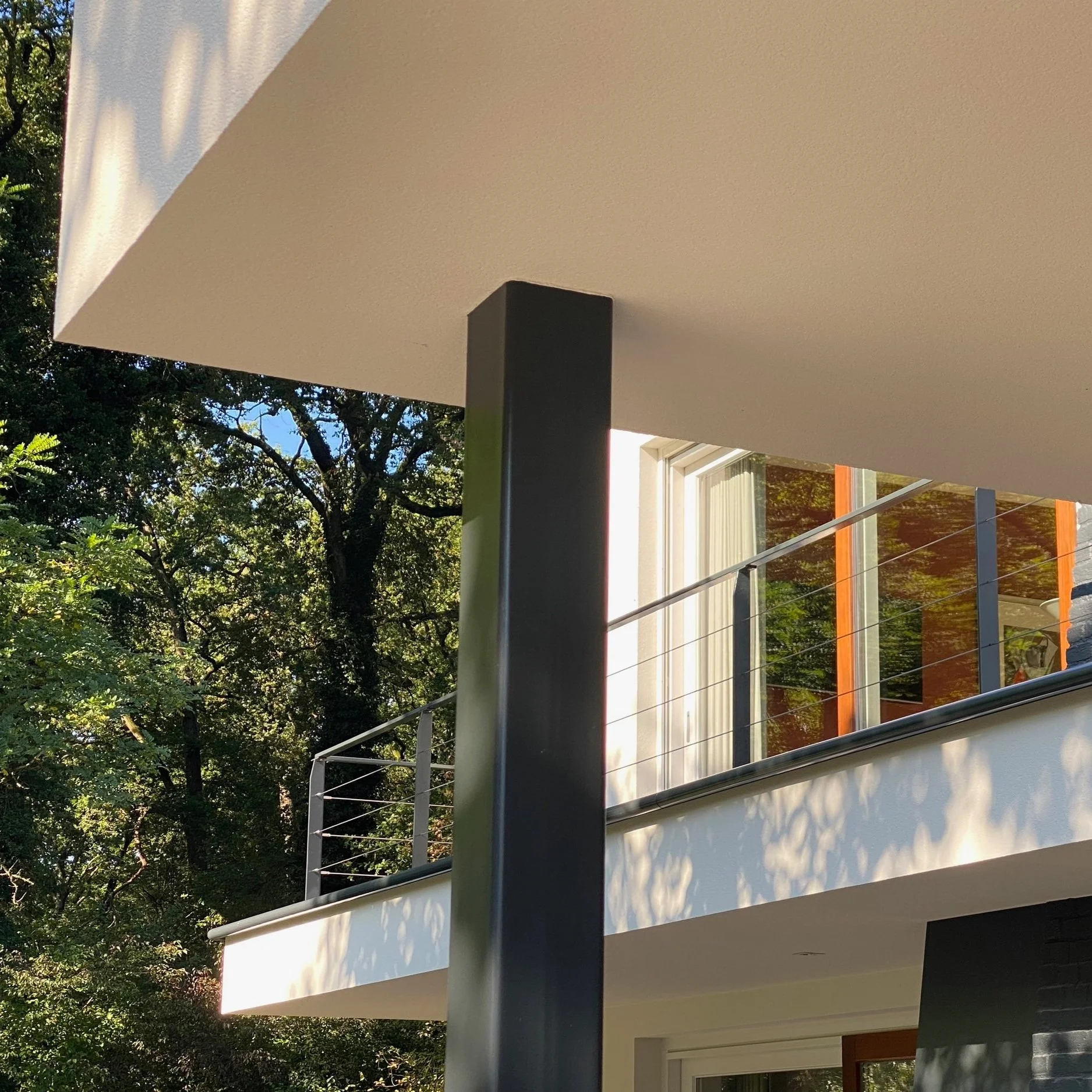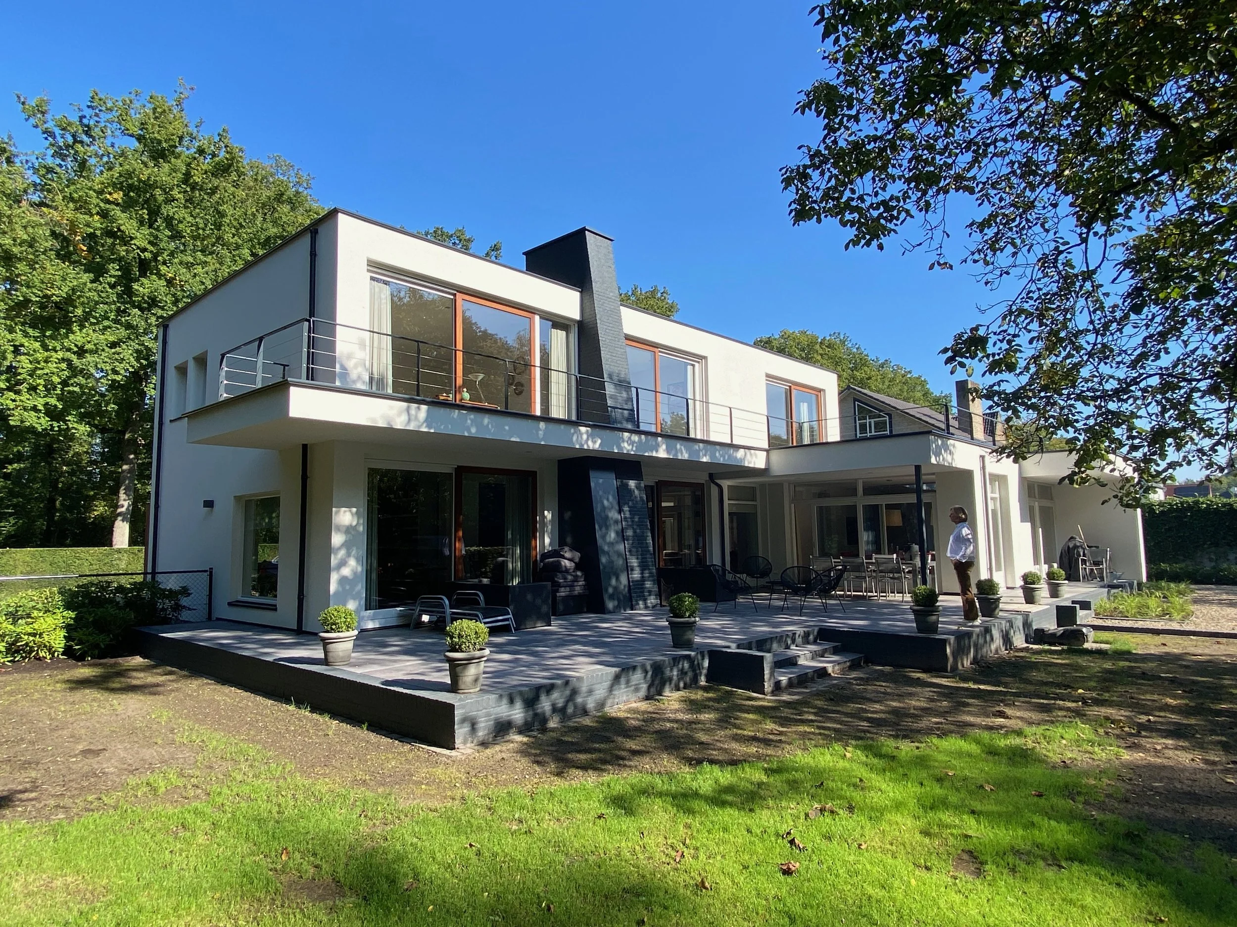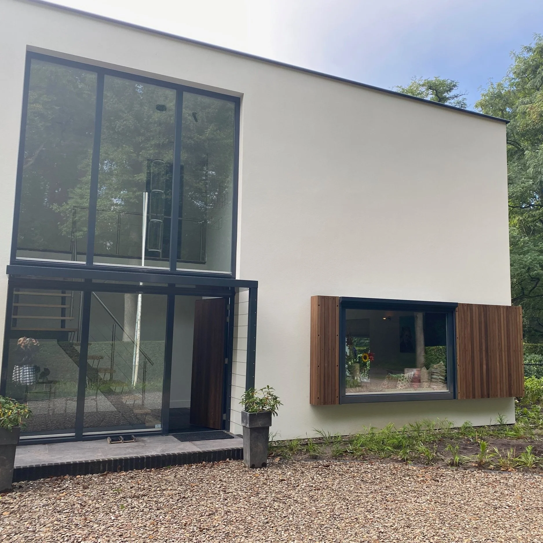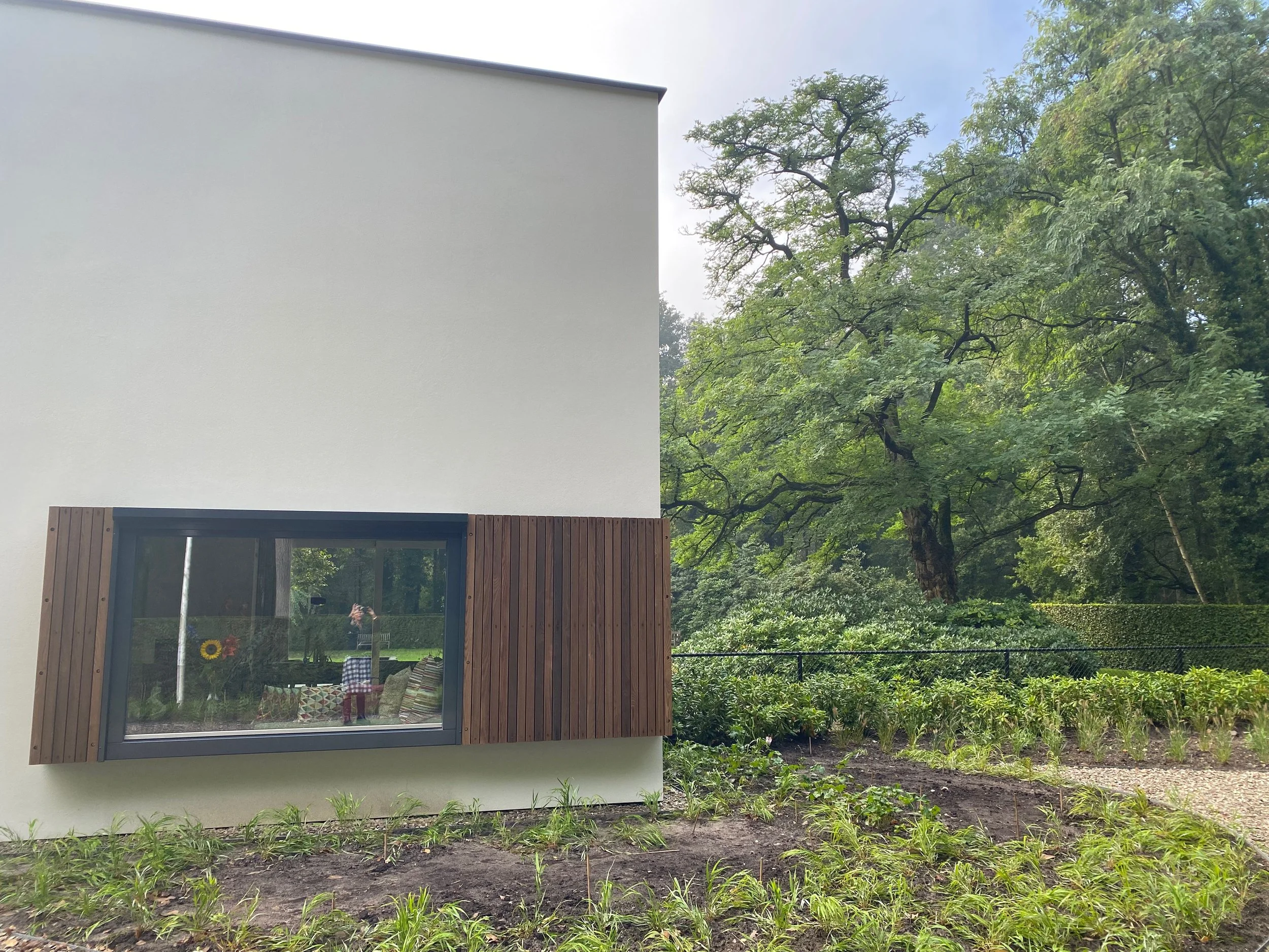 This villa, built in the sixties, was in need of a thorough renovation and making it sustainable. Elements of ash wood have been added to the facades, such as at both entrance doors at the front, the bay window in the living room, the front of the garage and the large sliding doors at the rear.