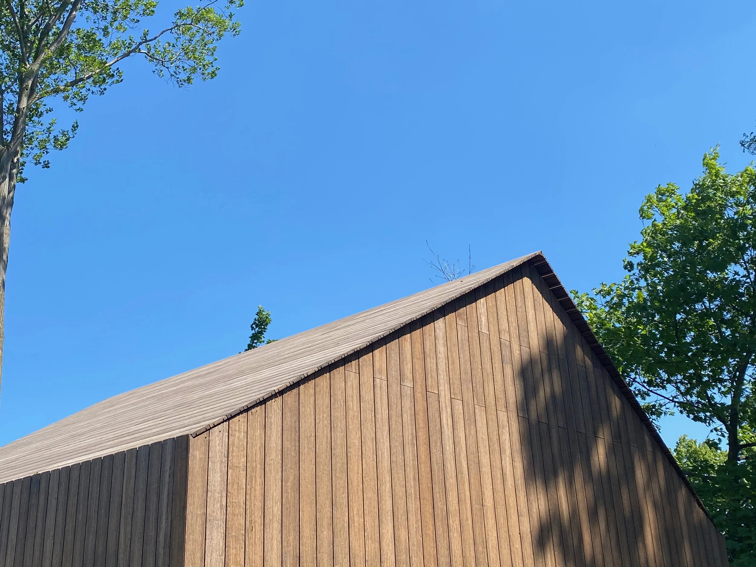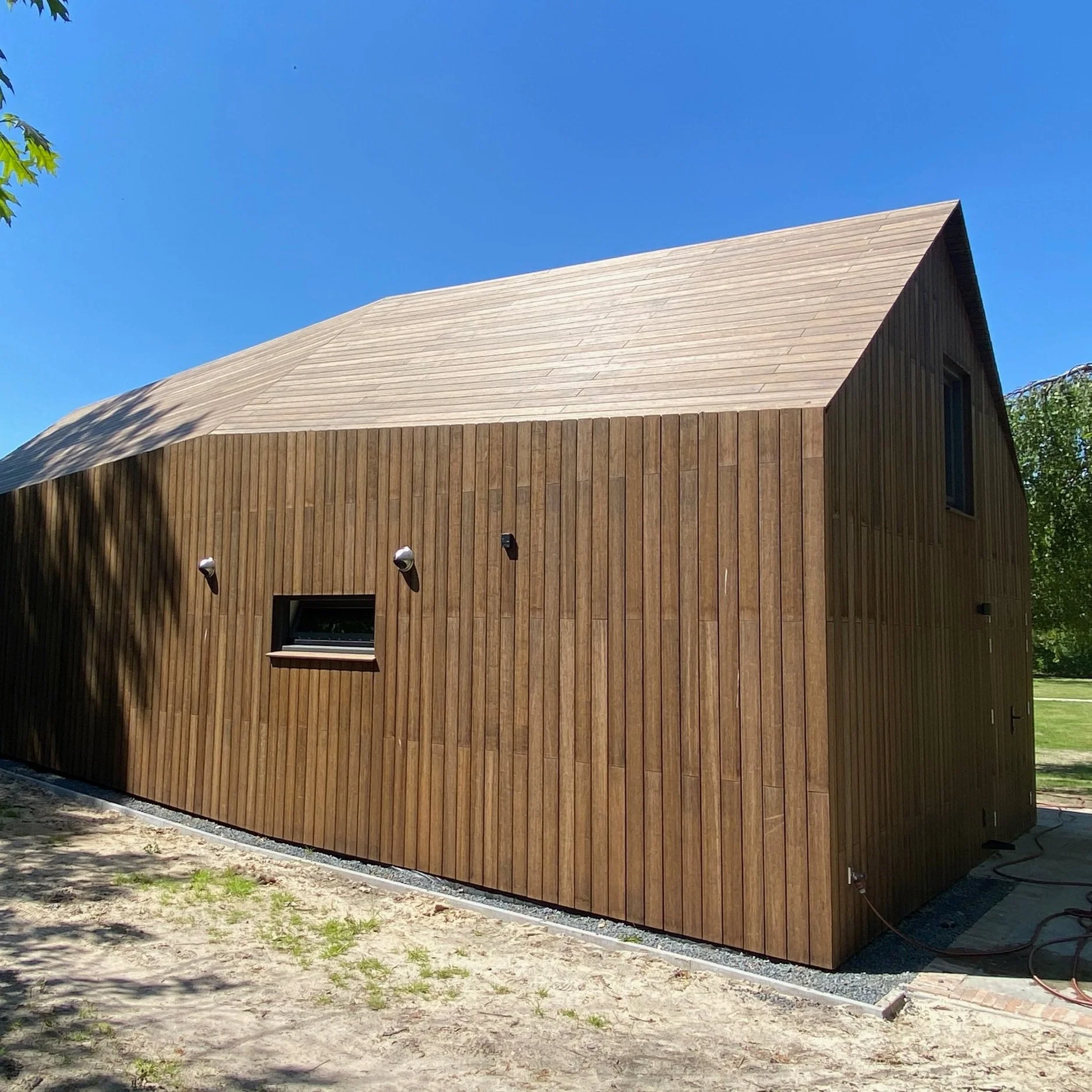 Bij een vrijstaande landelijke villa is een tiny house ontworpen met alle functies voor zelfstandige bewoning. De gevel en het dak van dit monolitisch bouwwerk zijn afgewerkt met Moso Bamboo X-Treme bevestigd met het GRAD gevelparket systeem van Awood uit Uden.